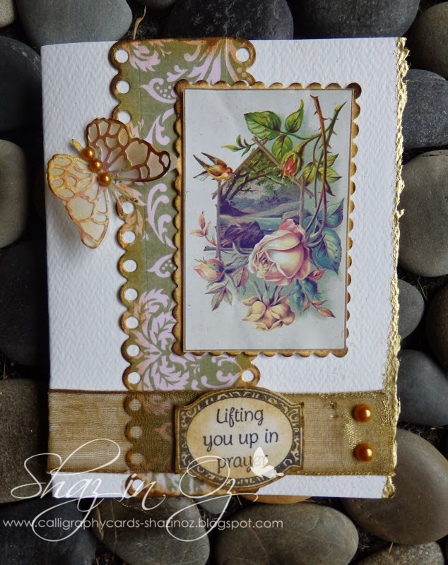 | Purpose of this card was to use scraps. All die cuts are that + tried out a new $5 Spellbinder. My dear friend Marilyn of Sharing Simple Things blog in US emailed that Scrapmart were selling spellbinders for $10 and $5. I ordered three SB through Marilyn - when they came there were six!! (she said they multiplied on the way but I know who multiplied them :D thank you, very dear kind friend). This Decorative Wrought Iron die was one of the gifts. Was double cut in two 200gsm card together then embossed in gold and rubbed with wax in green gold to give a verdigris look on bottom and right. Flowers have had for years, unused. Was really disappointed with this photo looks much better IRL. Love the die ad have other ideas for it. |