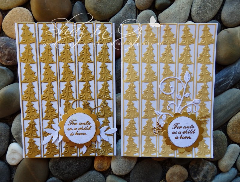 Here are my two for this month as one of the requirements are that we make two. Tis one was in my Pinterest page, pinned it from this blog here... this lady (Dutch so need to translate it) makes wonderful cards. Anyway as it turned out had five strips of the vellum already done in gold of this die- started with the vellum snippets (right card) first, then found some more gold snippets for second one.. various punches and dies used also, stamp is an Itty bitty stamp from years back. I like my Christmas cards to reflect the reason for Christmas somewhere hence "For unto us a child is born". Was good to dust this "JOY! Christmas tree border die" off, as had only made a few cards with it. But to be honest they take a while to cut five for each card and glue down - would not want to make half a dozen of cards with them.