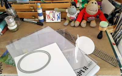 Desk 2 this is PanPastel part finished and heat embossed the Numbers verse from few weeks back (here - answered **PanPastel questions** at end of this post) by Stampendous. I used the T section of the Stamp-a-ma-jig to make sure I’d lined up wooden stamp correctly, with the measure twice stamp once technique!